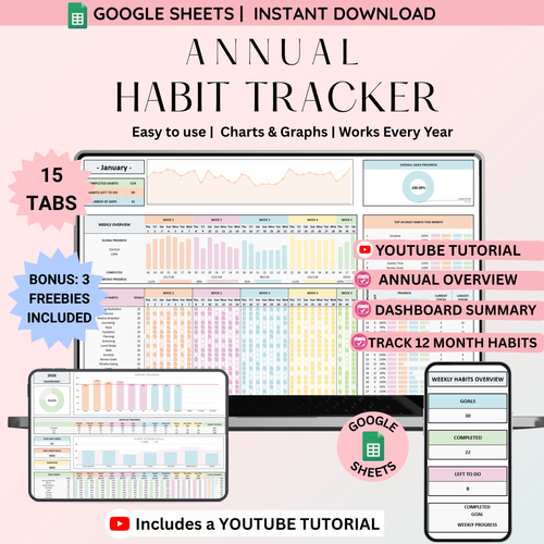 All-in-one annual tracker to help you manage your finances, track your progress, and stay organized all year.