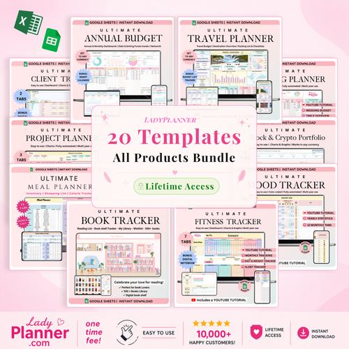 My 20 templates in one bundle to help you organize your finances, goals, business, and daily life. Simple to use, instant access, and built to save you time every week.